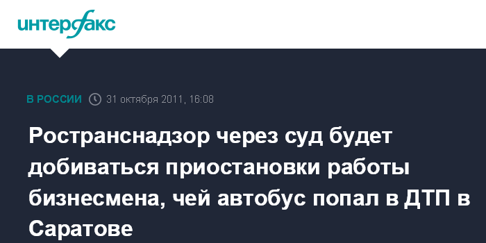 Москва. 31 октября. INTERFAX.RU - Автобус, попавший в ДТП в Саратове, не имел права перевозить детей, отмечается в сообщении, опубликованном на сайте Ространснадзора.
