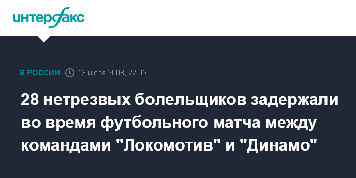Москва. 13 июля. ИНТЕРФАКС-МОСКВА - 28 человек задержано 13 июля во время матча чемпионата России, проходившего на стадионе "Динамо" между столичными "Локомотивом" и "Динамо", сообщили "Интерфаксу" в управлении информации и общественных связей ГУВД по г.Москве.