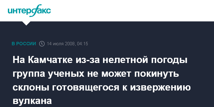 Петропавловск-Камчатский. 14 июля. ИНТЕРФАКС-ДАЛЬНИЙ ВОСТОК - Группа из 16-ти вулканологов, работающих на вулкане Безымянный на Камчатке, оказалась в опасности - вулкан готовится к извержению, а нелетная погода мешает снять ученых с его склонов.