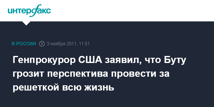 Вашингтон. 3 ноября. INTERFAX.RU - Генеральный прокурор США Эрик Холдер выразил удовлетворение вердиктом присяжных в отношении российского гражданина Виктора Бута и заявил, что ему грозит пожизненное заключение.