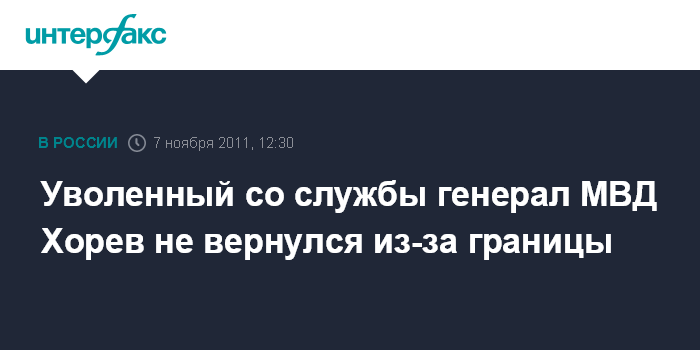 Москва. 7 ноября. INTERFAX.RU - Бывший первый заместитель начальника ДЭБ МВД России Андрей Хорев, который, по данным газеты "Коммерсант", стал фигурантом дела о получении взятки московским следователем Нелли Дмитриевой, в настоящее время находится за границей.