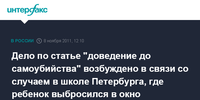 Дело по статье "доведение до самоубийства" возбуждено в связи со случаем в школе Петербурга, где ребенок выбросился в окно