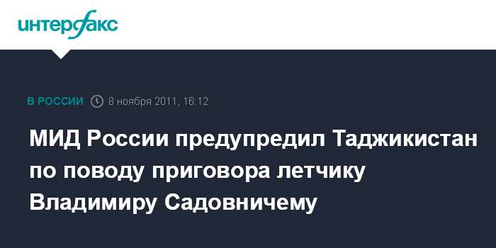 Москва. 8 ноября. INTERFAX.RU - Приговор российскому летчику Владимиру Садовничему, приговоренному в Таджикистане к 8,5 годам лишения свободы, не способствует укреплению отношений между Россией и Таджикистаном, заявляют в МИД РФ.