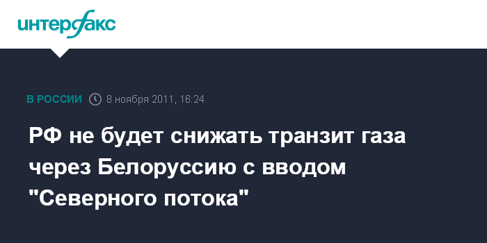 Любмин. 8 ноября. INTERFAX.RU - Снижения транзита российского газа через территорию Белоруссии по газопроводу Ямал-Европа с вводом в эксплуатацию газопровода "Северный поток" не предполагается, заявил глава "Газпром экспорта" Александр Медведев на брифинге во вторник.