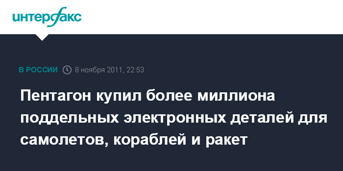 Лондон. 8 ноября. INTERFAX.RU - Комитет по делам вооруженных сил Сената США выявил 1,8 тыс. случаев, когда Пентагон закупал контрафактные электронные чипы, использующиеся на военных самолетах, кораблях и ракетах, пишет во вторник британская газета The Daily Telegraph. По подсчетам комитета, существуют данные о поставках не менее миллиона таких поддельных деталей.