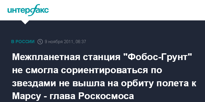 Межпланетная станция "Фобос-Грунт" не смогла сориентироваться по звездами не вышла на орбиту полета к Марсу - глава Роскосмоса