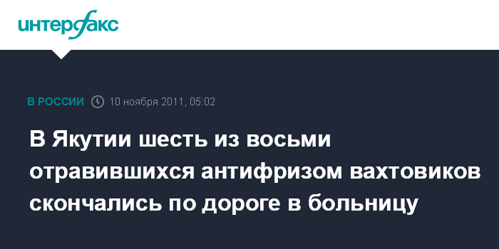 Якутск. 10 ноября. ИНТЕРФАКС-ДАЛЬНИЙ ВОСТОК - Шесть отравившихся накануне антифризом вахтовиков из поселка Мостотряд в Якутии скончались, не добравшись до больницы, сообщил в четверг агентству "Интерфакс-Дальний Восток" руководитель пресс-службы МЧС по Якутии Алексей Хлыбов.