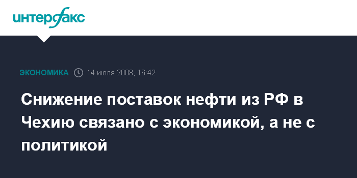 Москва. 14 июля. INTERFAX.RU - Снижение поставок нефти из России в Чехию связано с экономическими, а не с политическими причинами, заявил Агентству нефтяной информации (АНИ) вице-президент АК "Транснефть" Михаил Барков.