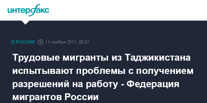 Москва. 11 ноября. ИНТЕРФАКС - У трудовых мигрантов из Таджикистана возникли проблемы с получением разрешений на работу в России, сообщил "Интерфаксу" в четверг вечером глава Федерации мигрантов России Мухаммад Амин.