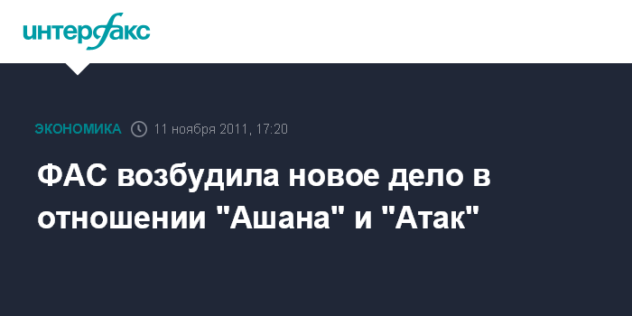 Москва. 11 ноября. INTERFAX.RU - Федеральная антимонопольная служба (ФАС) РФ возбудила дело в отношении ООО "Ашан" и ООО "Атак" (входят во французскую группу Auchan) по признакам нарушения пункта 1 части 1 статьи 13 закона о торговле, говорится в сообщении ФАС.