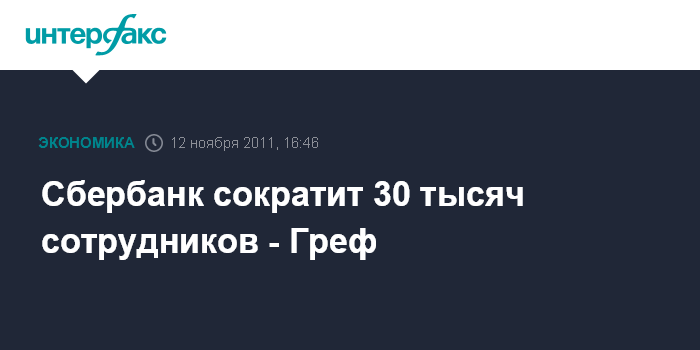 Москва. 12 ноября. INTERFAX.RU - Сбербанк по итогам внедрения инновационных компьютерных технологий сократит около 30 тыс. сотрудников, сообщил глава банка Герман Греф премьер-министру РФ Владимиру Путину в ходе совместного осмотра центра сопровождения клиентских операций банка. "30 тыс. человек (будет сокращено - ИФ)", - сказал Г.Греф, отвечая на вопрос В.Путина о том, сколько человек будет сокращено по итогам завершения модернизации банка. На сегодняшний день численность сотрудников Сбербанка составляет 240 тыс. человек.