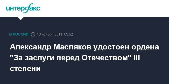 Москва. 13 ноября. INTERFAX.RU - Президент РФ Дмитрий Медведев наградил руководителя КВН Александра Маслякова орденом "За заслуги перед Отечеством" III степени, сообщает в воскресенье сайт Кремля.
