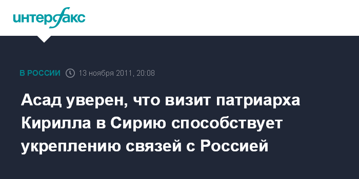 Дамаск. 13 ноября. INTERFAX.RU - Визит патриарха Московского и всея Руси в Сирию укрепит российско-сирийские отношения, заявил сирийский президент Башар Асад на встрече с предстоятелем Русской православной церкви в воскресенье в своей резиденции в Дамаске.