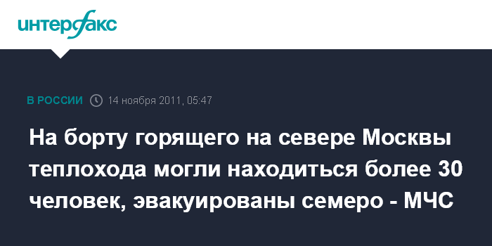 Москва. 14 ноября. ИНТЕРФАКС - Семь человек эвакуированы с теплохода "Сергей Абрамов", сообщил "Интерфаксу" руководитель пресс-службы ГУ МЧС России по Москве Евгений Бобылев.