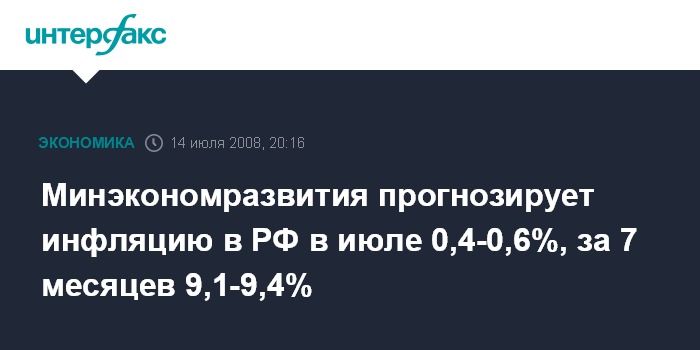 По итогам I полугодия 2008 года инфляция в России составила 8,7%, на 3 процентных пункта превысив показатель I полугодия 2007 года (5,7%). Нынешний официальный прогноз правительства и ЦБ на 2008 год, утвержденный в мае, составляет 9-10,5% (против изначальных 7%, которые были заложены в бюджете на 2008 год). Чтобы уложиться в этот прогноз, инфляция во II полугодии должна быть менее 1,8%, что по мнению всех экономистов, участвующих в составлении консенсус-прогноза "Интерфакса", является нереальным.