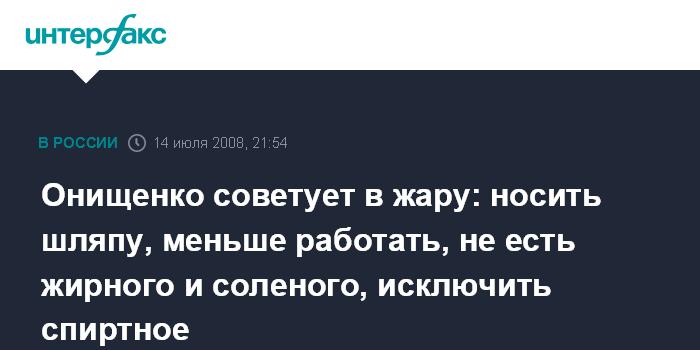 "Наступившая жара, лето, вдруг пришедшее в середине июля, резко оборвало стенания москвичей и жителей других мегаполисов России по поводу того, что с природой, мол, происходит что-то неладное. Вместе с тем оно востребовало необходимость еще раз напомнить нашим согражданам о том, что им нужно делать, особенно пожилым, и, следовательно, имеющим проблемы со здоровьем системного характера", - заявил Г.Онищенко "Интерфаксу".