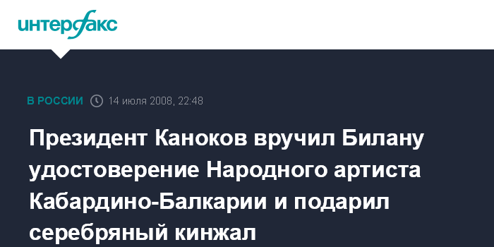 Звания "Народный артист Кабардино-Балкарии" Д.Билан - уроженец республики, - был удостоен за победу в конкурсе "Евровидение - 2008". Ранее за втрое место в "Евровидении - 2006" ему было присвоено звание "Заслуженный артист Кабардино-Балкарии".