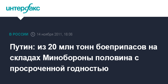 Москва. 14 ноября. INTERFAX.RU - В настоящее время на складах Минобороны скопилось 20 млн тонн боеприпасов, у 50% которых истек срок годности, сообщил премьер-министр РФ Владимир Путин.
