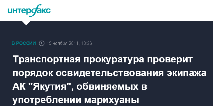 Магадан. 15 ноября. INTERFAX.RU - В транспортную прокуратуру Магадана поступило официальное обращение от авиакомпании "Якутия", на основании которого транспортные прокуроры намерены проверить работу местных медиков, обнаруживших в моче экипажа марихуану.