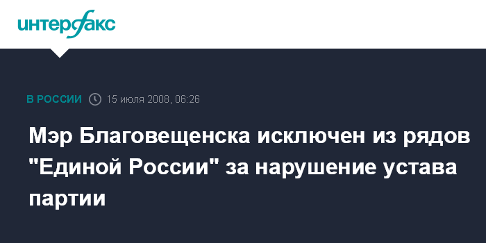 Благовещенск. 15 июля. ИНТЕРФАКС-ДАЛЬНИЙ ВОСТОК - Члены Благовещенского городского отделения "Единой России" исключили из партии мэра города Александра Мигулю.