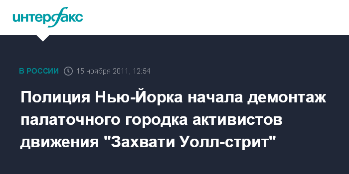 Вашингтон. 15 ноября. INTERFAX.RU - Сотрудники правопорядка Нью-Йорка начали разбирать палаточный городок активистов движения "Захвати Уолл-стрит" в парке Зукотти, сообщают во вторник местные СМИ.