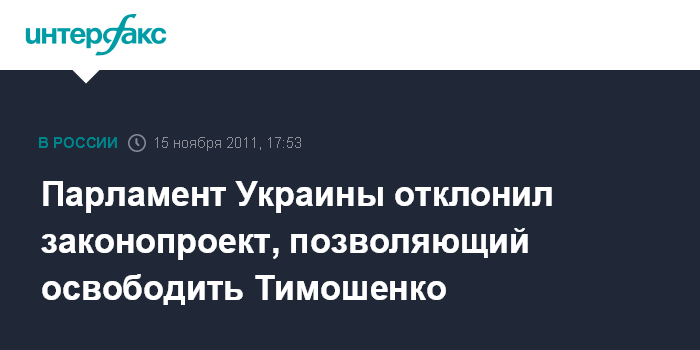 Киев. 15 ноября. INTERFAX.RU - Верховная Рада Украины не поддержала поправку к президентскому законопроекту о гуманизации ответственности за преступления в сфере хозяйственной и служебной деятельности, которая позволяла бы освободить из заключения экс-премьера Юлию Тимошенко, осужденную 11 октября Печерским райсудом Киева.