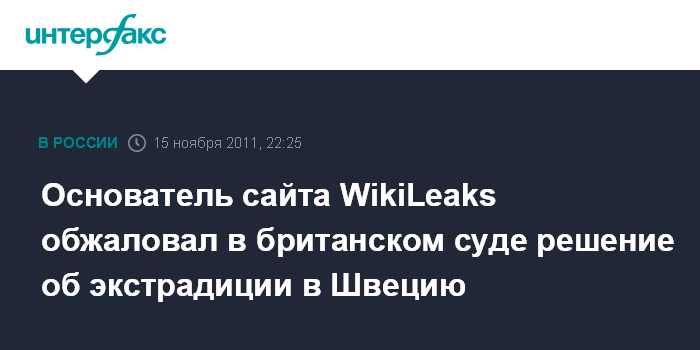 Лондон. 15 ноября. INTERFAX.RU - Основатель сайта WikiLeaks Джулиан Ассандж во вторник подал апелляцию в Верховный суд Великобритании на решение о его экстрадиции в Швецию, сообщает BBC.