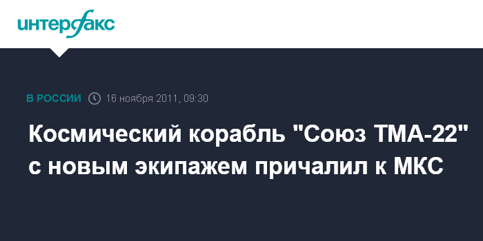 Королев (Московская область). 16 ноября. INTERFAX.RU - Пилотируемый космический корабль "Союз ТМА-22" с тремя космонавтами пристыковался к модулю "Поиск" российского сегмента Международной космической станции (МКС), передал корреспондент "Интерфакса-АВН" из Центра управления полетами (ЦУП).