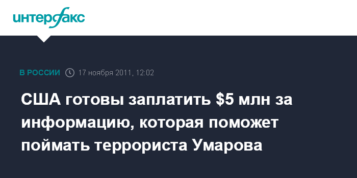 "В связи с решением Верховного суда России, на основании ходатайства Генпрокуратуры РФ о признании так называемого "имарата Кавказа" во главе с Д.Умаровым террористической организацией госсекретарь США включил его в список наиболее опасных террористов и объявил вознаграждение за информацию о его месте нахождения в размере 5 млн долларов", - сообщил замгенпрокурора России Виктор Гринь в четверг на научно-практической конференции в Москве по противодействию экстремизму и терроризму.