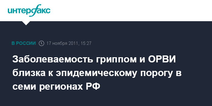 "Заболеваемость гриппом и ОРВИ на уровне эпидпорогов отмечается в 7 субъектах РФ: Рязанской, Волгоградской, Нижегородской, Челябинской областях, Москве, Ненецком автономном округе, республике Марий Эл", - говорится в материалах Роспотребнадзора, розданных в четверг перед пресс-конференцией руководителя ведомства Геннадия Онищенко в центральном офисе "Интерфакса".