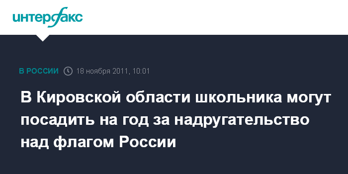 Москва. 18 ноября. INTERFAX.RU - Школьник стал фигурантом уголовного дела в Кировской области после того, как снял со здания районного суда российский флаг и выбросил его.