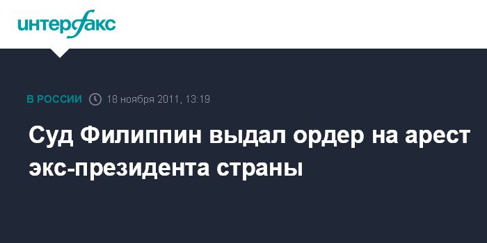 Манила. 18 ноября. INTERFAX.RU - Власти Филиппин выдали ордер на арест бывшего президента страны Глории Арройо, сообщил в пятницу представитель местного суда.