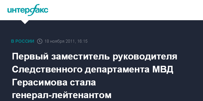 "Указом президента первому заместителю руководителя Следственного департамента МВД России Татьяне Герасимовой присвоено очередное специальное звание - генерал-лейтенант юстиции", - сказали в пресс-службе.