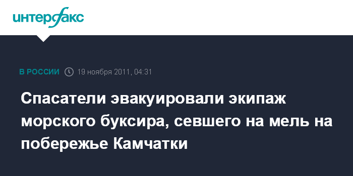 Петропавловск-Камчатский. 19 ноября. ИНТЕРФАКС-ДАЛЬНИЙ ВОСТОК - Спасатели на вертолете МИ-8 МЧС России эвакуировали в субботу семерых членов экипажа морского буксира "Садко", севшего на мель в устье реки Тигиль на севере Камчатки, и двух членов баржи, которую "Садко" буксировал.