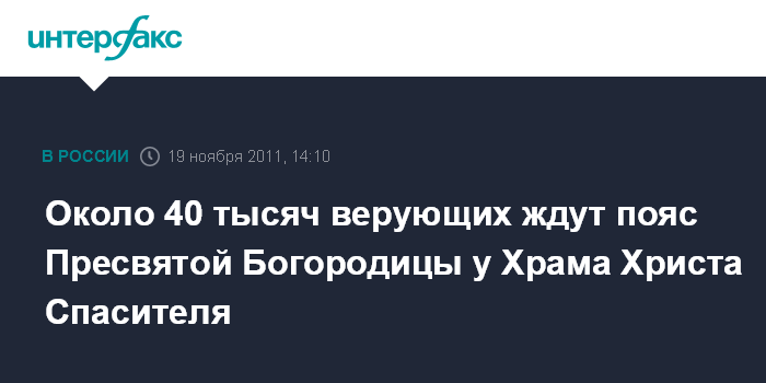 Москва. 18 ноября. INTERFAX.RU - Около 40 тыс. верующих собрались в районе Храма Христа Спасителя, ожидая прибытия пояса Пресвятой Богородицы, сообщил заместитель начальника полиции - начальник управления охраны общественного порядка ГУ МВД России по Москве Вячеслав Козлов.