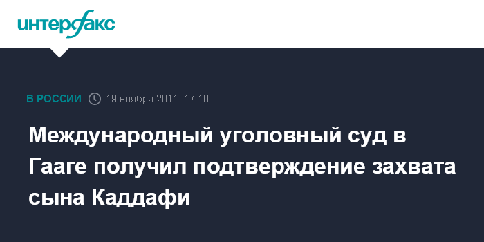 Гаага. 19 ноября. INTERFAX.RU - В Международном уголовном суде (МУС) в субботу получили подтверждение ареста сына Муамара Каддафи Сеифа аль-Ислама. "Мы координируем с ливийским министерством юстиции ситуацию, чтобы арест С.аль-Ислама соответствовал законодательству", - говорится в заявлении, распространенном пресс-службой МУС. МУС выдал международный ордер на арест С.аль-Ислама Каддафи 27 июня.