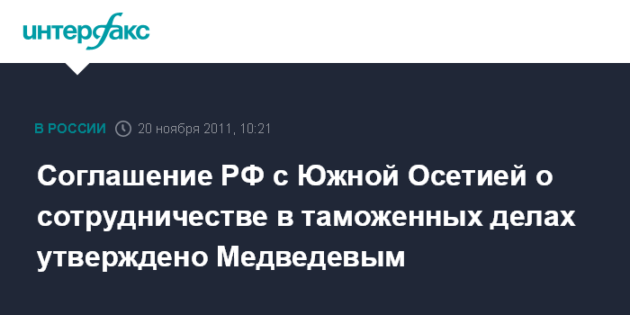 Москва. 20 ноября. INTERFAX.RU - Президент России Дмитрий Медведев подписал закон "О ратификации Соглашения между Российской Федерацией и Республикой Южная Осетия о сотрудничестве и взаимопомощи в таможенных делах". Закон был принят Государственной Думой 2 ноября и одобрен Советом Федерации 9 ноября 2011 года, сообщает в воскресенье пресс-служба Кремля.