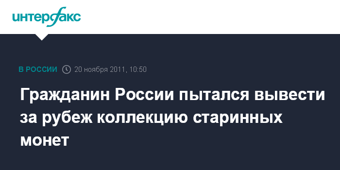 Москва. 20 ноября. INTERFAX.RU - Гражданин России пытался контрабандным способом вывезти из страны коллекцию старинных монет, сообщила пресс-секретарь Центральной оперативной таможни Фаина Сведовая. По ее словам, в отношении него правоохранительными подразделениями Курской таможни возбуждено уголовное дело по ч.2 ст.188 УК РФ (контрабанда).