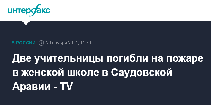 Дубай. 20 ноября. INTERFAX.RU - По меньшей мере две учительницы погибли в результате пожара в женской школе в городе Джидда, расположенном на западе Саудовской Аравии у побережья Красного моря, сообщает в воскресенье межарабский телеканал "Аль-Арабийя". Спасателям удалось ликвидировать огонь, в данный момент все еще продолжается эвакуация 700 учениц, 110 преподавательниц и 32 сотрудниц школы.