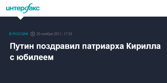Москва. 20 ноября. INTERFAX.RU - Председатель правительства РФ Владимир Путин поздравил в воскресенье патриарха Московского и Всея Руси Кирилла с юбилеем.