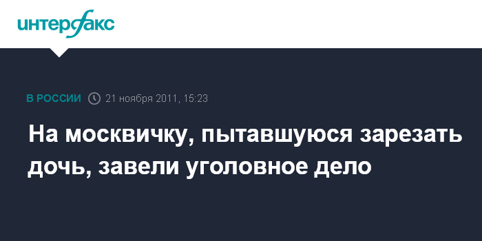 Москва. 21 ноября. INTERFAX.RU - Столичные следователи СК РФ возбудили уголовное дело в отношении психически больной женщины, пытавшейся убить свою малолетнюю дочь, сообщила официальный представитель следственного управления СК по Москве Виктория Цыпленкова.
