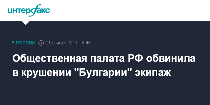 Москва. 21 ноября. INTERFAX.RU - Причиной катастрофы теплохода "Булгария" в Куйбышевском водохранилище стало грубейшее нарушение экипажем ряда мер безопасности, сообщает пресс-служба Общественной палаты РФ.