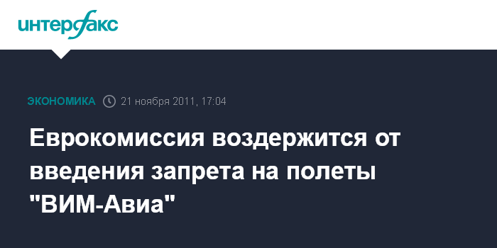 Москва. 21 ноября. INTERFAX.RU - Еврокомиссия решила воздержаться от введения запрета на операционную деятельность авиакомпании "ВИМ-Авиа", полеты которой в Европу уже запрещены российским регулятором, говорится в пресс-релизе Еврокомиссии.