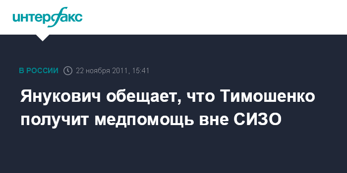 Киев. 22 ноября. INTERFAX.RU - Президент Украины Виктор Янукович заявляет, что экс-премьеру Юлии Тимошенко, содержащейся в Лукьяновском СИЗО, будет предоставлена необходимая медицинская помощь в ближайшее время.