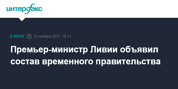 Дубай. 22 ноября. INTERFAX.RU - Премьер-министр Ливии Абдуррахим аль-Кейб во вторник представил состав временного правительства страны, сообщает межарабский телеканал Al Jazeera со ссылкой на источник в Национальном переходном совете (НПС).