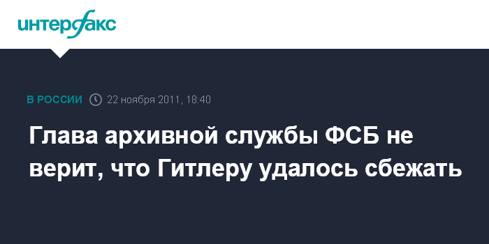 Москва. 22 ноября. INTERFAX.RU - Эксперты Федеральной службы безопасности РФ исключают вероятность того, что главе фашистской Германии Адольфу Гитлеру в конце Второй мировой войны удалось спастись.
