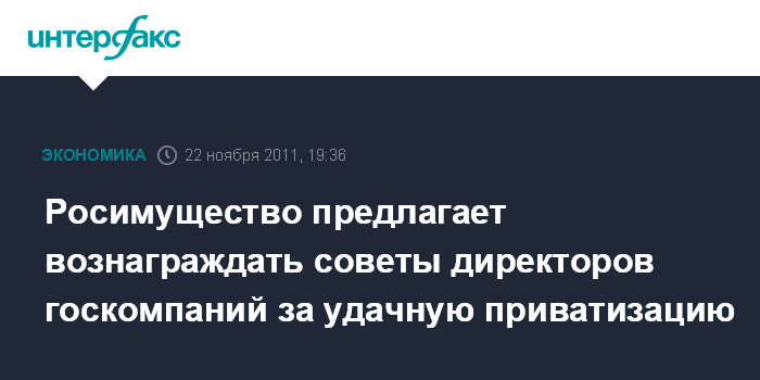 Москва. 22 ноября. INTERFAX.RU - Росимущество считает целесообразным внедрить систему вознаграждения членам советов директоров госкомпаний при удачных приватизационных размещениях акций, заявил исполняющий обязанности руководителя Росимущества Глеб Никитин, выступая на форуме "Корпоративное управление: вызовы и приоритеты" во вторник в Москве.