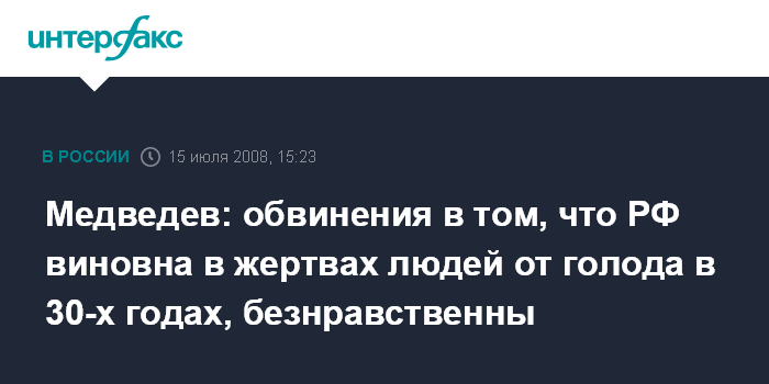 Москва. 15 июля. INTERFAX.RU - Президент РФ Дмитрий Медведев считает безнравственными и конъюнктурными обвинения в адрес России в том, что якобы она виновна в жертвах людей от голода в 30-х годах прошлого века в СССР.