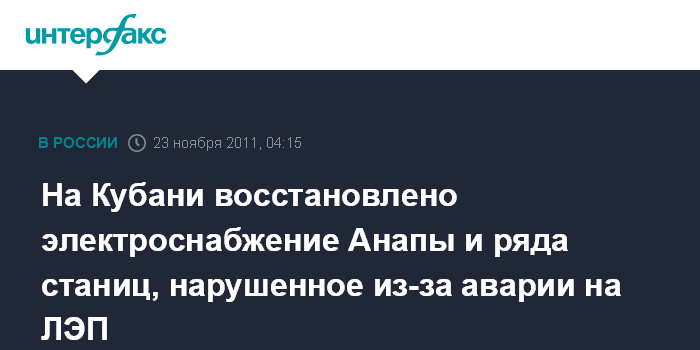 Краснодар. 23 ноября. ИНТЕРФАКС-ЮГ - Восстановлено электроснабжение в Анапском районе Краснодарского края и двух станицах Новороссийска, нарушенное из-за повреждения провода на воздушной линии электропередачи 110 кВ "Кирилловская - Раевская" вечером во вторник.