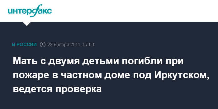 Иркутск. 23 ноября. INTERFAX.RU - Утром в среду в иркутском садоводстве загорелся трехэтажный частный дом, в пожаре погибли жена и двое детей хозяина дома, мужчина успел спастись, организована доследственная проверка, сообщает пресс-служба СУ СКР по Иркутской области.
